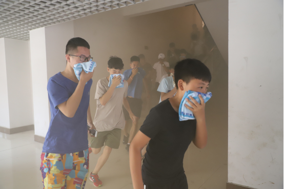 演练现场,教官详细讲解了火灾逃生方法和注意事项。各班级听到疏散信号后,班主任现场指挥,同学们用湿毛巾捂住口鼻,低下头,弯着腰,紧张而有序地撤离到安全区域。